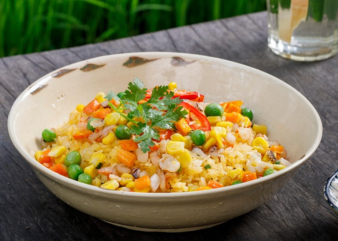 Long-grained rice, warm peas, carrots, and onions are all combined with scrambled eggs to make fried rice. This will produce a delicious recipe that helps you to lose weight.